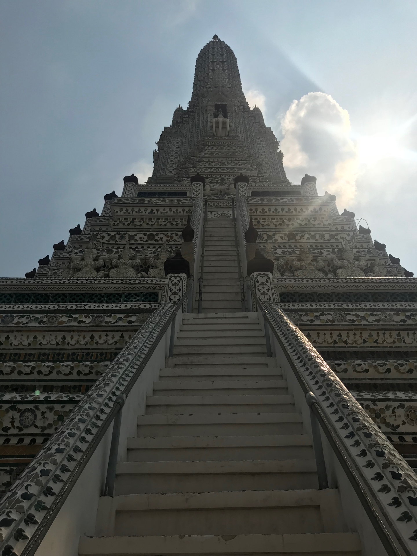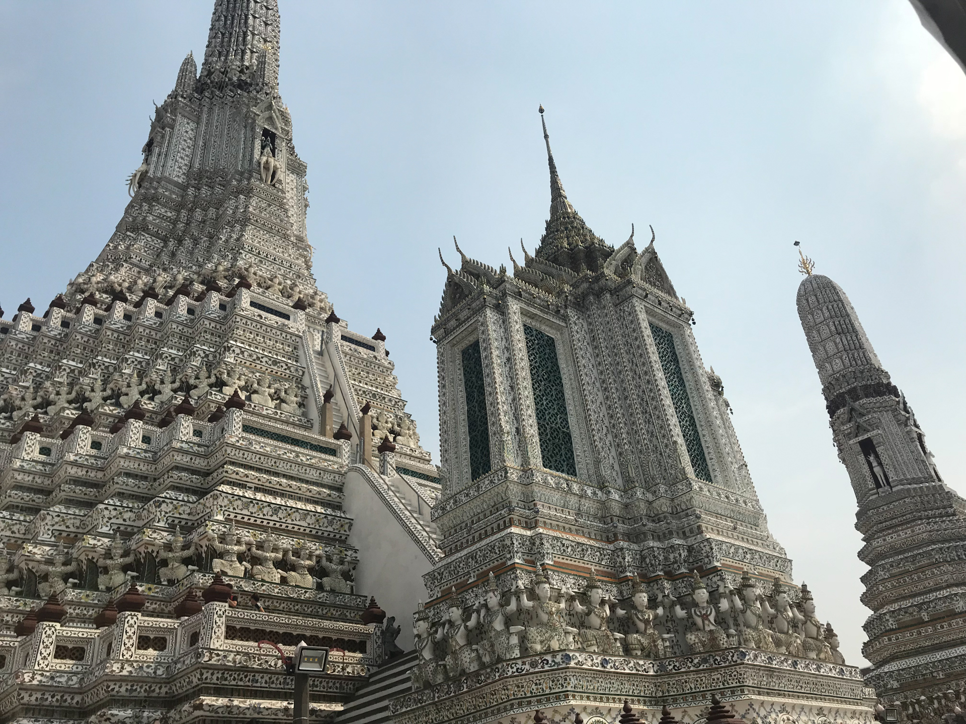 街のシンボルらしい大きなラウンドアバウトでUVERをつかまえ、「暁の寺」ことワット・アルンへ。ここに来るのは20年ぶりぐらいだろうか。川沿いにあるということ以外、ほとんど記憶がなかった。ずいぶん周辺も整備されていて、きれいな観光地という趣。白を貴重にしてカラフルな彩色をされた塔は圧巻だ。これが今年の初詣となった。