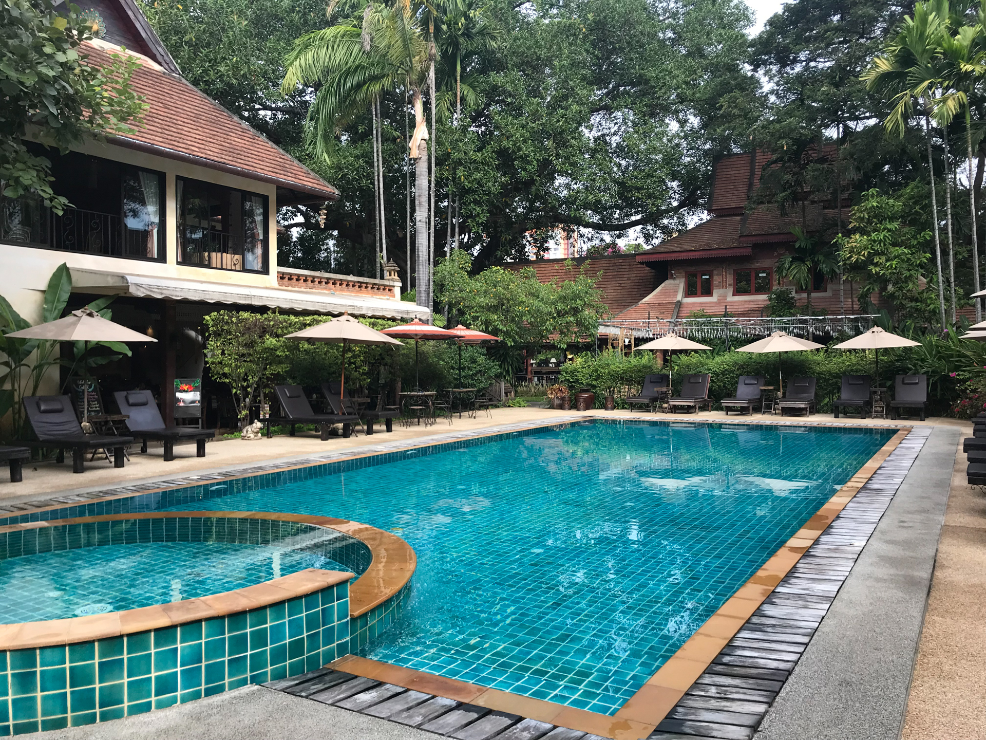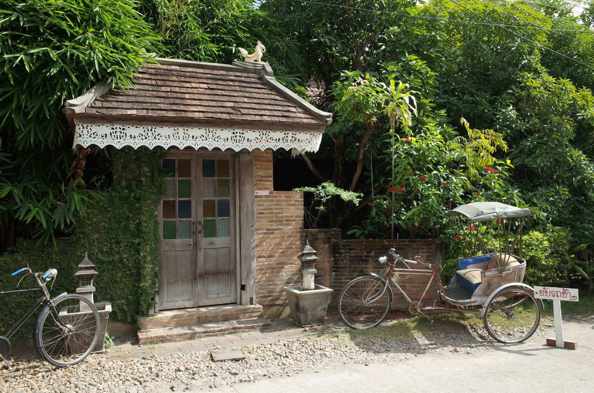 ランチはタクシーで郊外の古民家レストランへ。広大な敷地に海の家のような開放的な木造建築が建っていて、みんなわいわい食事をしている。2階席はお座敷で古家具がポツポツと置いてあってとても素敵だ。お酒はないので日本からワインを持ってきた。タイのレストランと言うのは基本お酒持ち込みオーケーのようだ。日本の感覚だとびっくりするが、そもそも食中酒の文化がないのでお店も用意していない。おおらかでいいな。