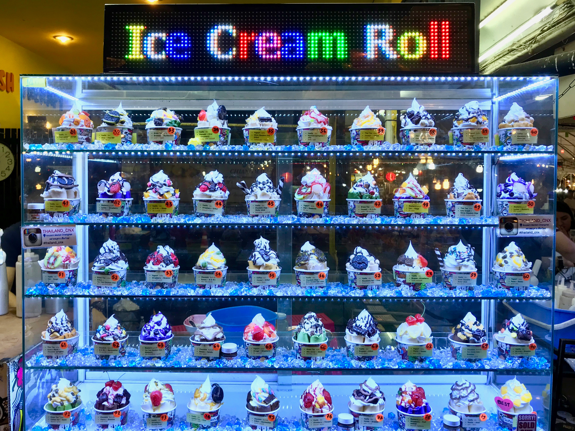 タイのレストランは基本的にものすごく早く出てくるので、さっさと食べ終わって出ることになる。夜はアヌサン市場に連れて行ってもらった。ここは大混雑の観光夜市・ナイトマーケットよりもいくぶん歩きやすいらしい。お土産物がメインだがアイスをくるくる巻いてカップに水さしてデコってくれるアイス屋さんが人気のようだった。Instagramを意識している!