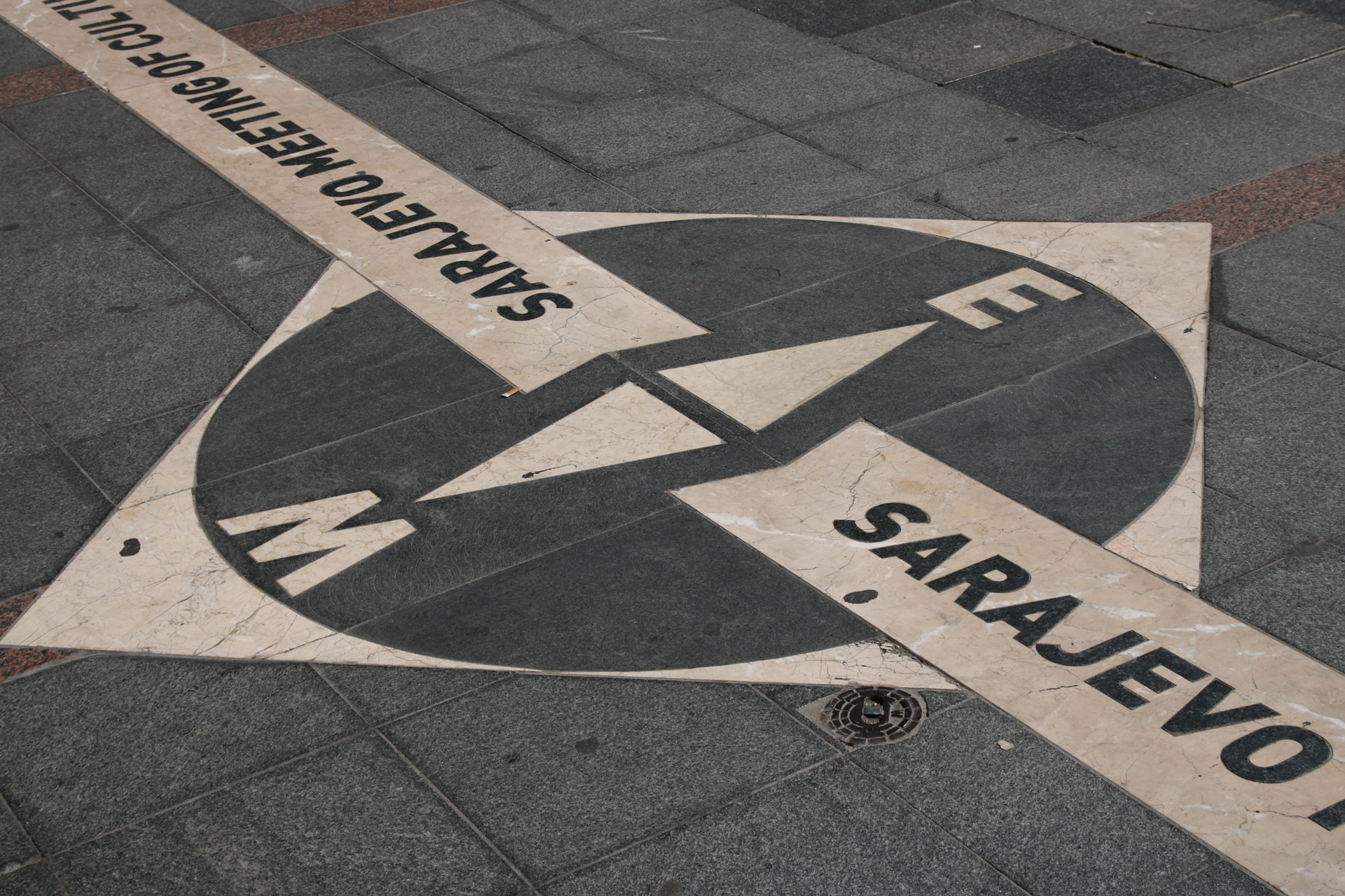 ラティンスキ橋。ここが世界史の教科書に載ってた「サラエボ事件」の現場かと感慨深い。オーストリア皇太子、初回の爆破テロは回避したのに、帰り道に狙撃されてしまったというのが悲しい。