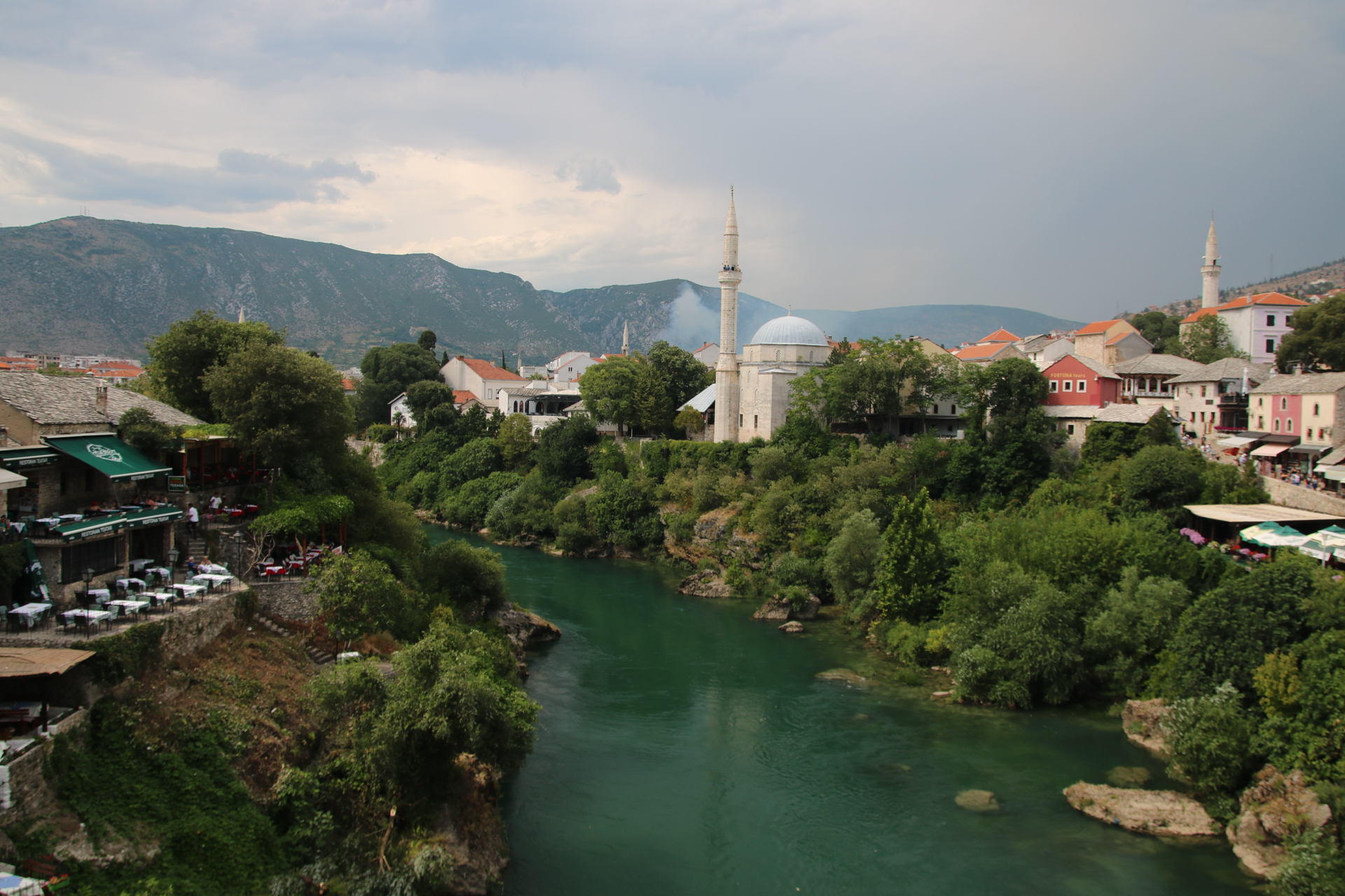 モスタルに移動。40度近い。さらにイスラム色が強まる。この町の象徴であるスタリモスト(石橋)はもはや半円に近いような丸い橋で、丸い敷石も観光客の靴底で磨かれてツルツルになっている。雨が降ったら危なくて渡れないかもしれない。橋の上で金を集めて25mの高さから飛びこみをする男が何人かいた。50ユーロ集まったら飛ぶらしい。